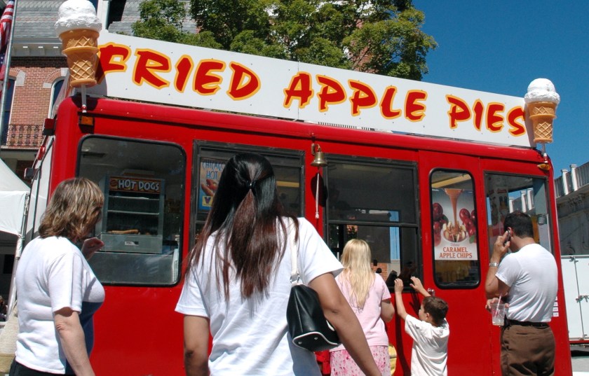Festival attendees crowd around an apple pie vendor on the Square in Covington on Sunday, the final day of the 17th annual Southern Heartland Arts Festival. Temperatures were mild, and there wasn’t a cloud in the sky as people convened to enjoy some tasty treats, music and shopping. About 75 vendors manned booths around the Square selling their wares.